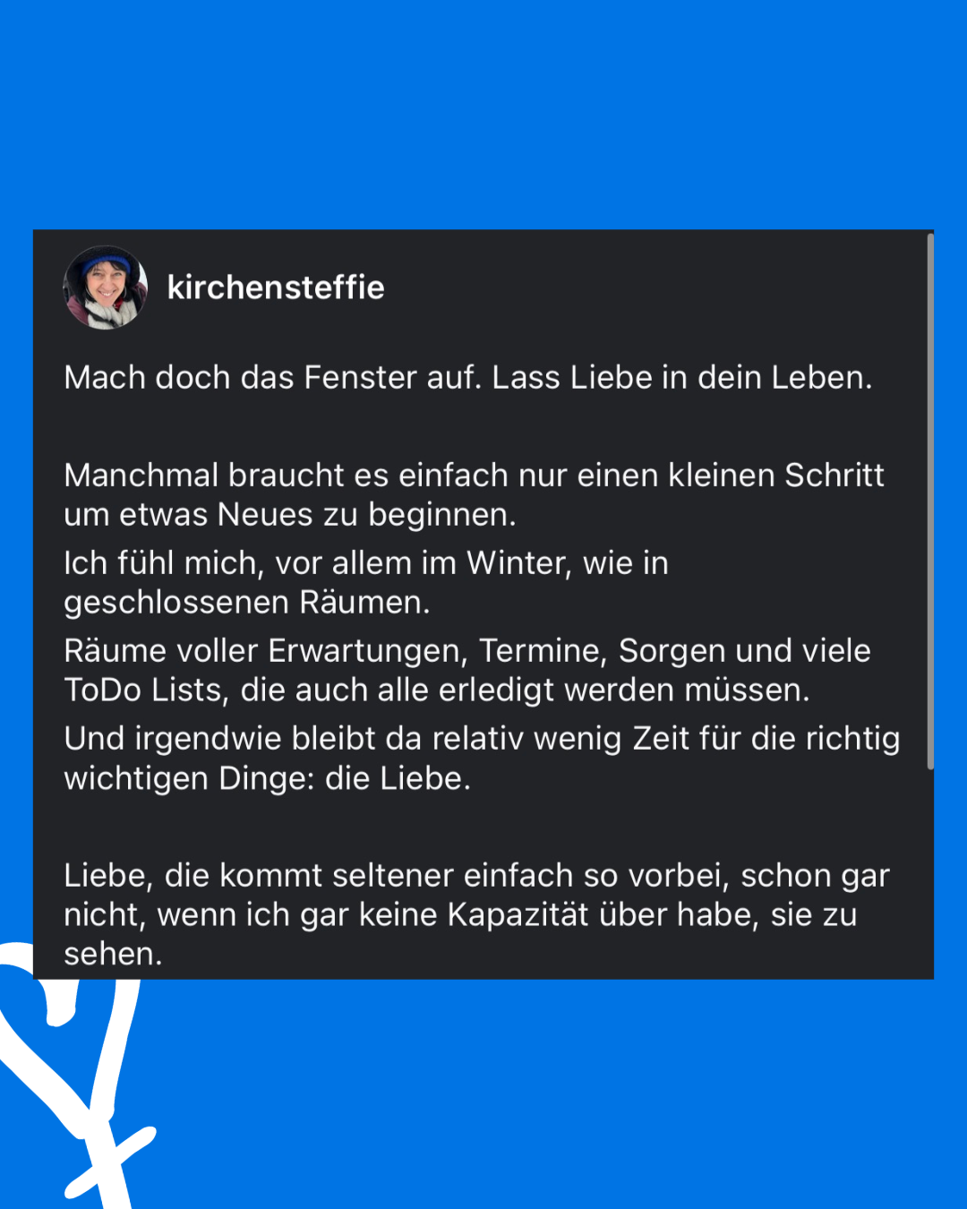 Hier gibts Einblicke in meinen Alltag und meinen Glauben. Ich bin gerne kreativ und das sieht man auch in meiner Spiritualität. Ich beschäftige mich viel mit der Bibel und baue mir gerne so kleine Mini-Rituale, die sich in den Alltag integrieren lassen.